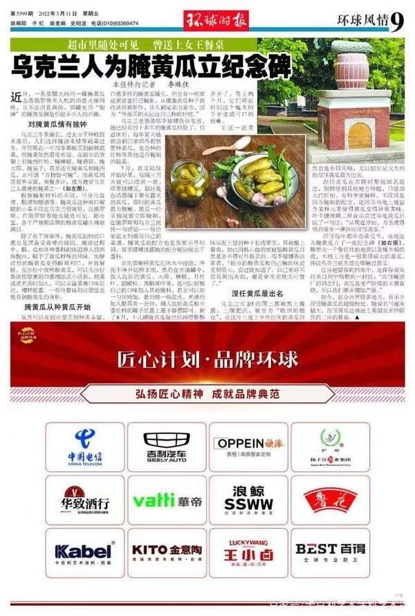 2022年3月11日,卡百利艺术涂料、中国电信、吉利汽车、欧派衣柜、扬子江药业、华致酒行、华帝、浪鲸卫浴、鲁花、金意陶、王小卤、百得厨卫12家大牌强势联袂,参与了“匠心计划·品牌环球”的主题推广,以“集群”的方式亮相环球时报第5599期。