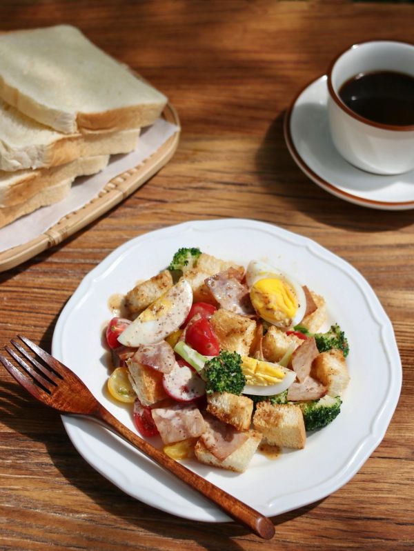 做好的面包切小块在烤箱烘烤至金黄,和水煮蛋、西蓝花、小番茄、牛肉火腿放一起,加入低脂油醋汁搅拌均匀,粗粮吐司沙拉就做好了,营养和口感不比专业轻食店的差,成本却低了很多,还能自己控制糖和脂肪的摄入,简直不要太开心!