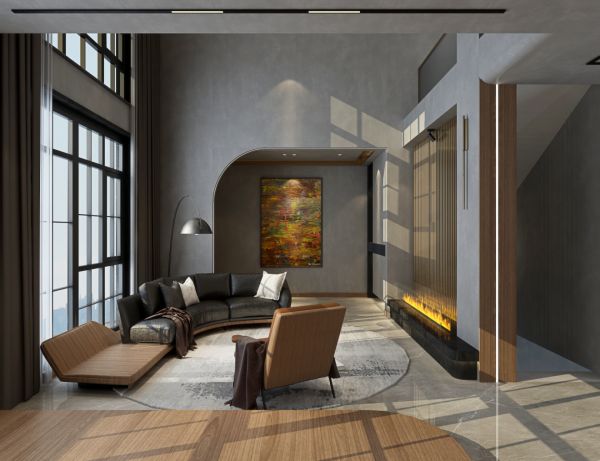 空间以质朴柔和的自然色彩氛围展开叙事。灰色调的微水泥带来一种沉浸的体验,挑高的空间展现了立体层次的魅力,游走其中的动线自由又灵活。弧形垭口和意式弧形沙发呼应,犹如无形的拥抱,向往家的港湾。