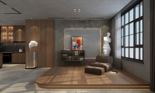 有这样一个空间,安逸、规律、温暖,在自由的形态中,构建了专属于这个家的空间秩序。休闲区解决了有关生活的娱乐性需求,与客厅以弧形地台区分又极具空间感。