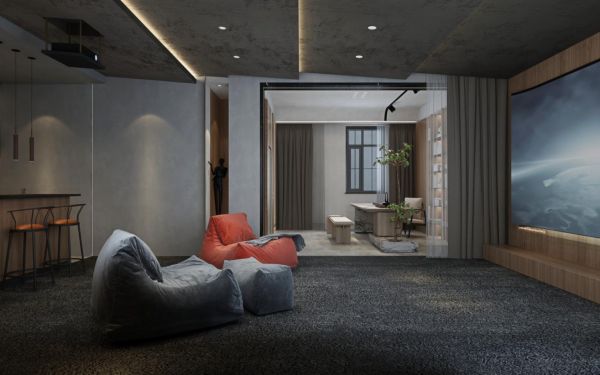 通透的天井,阳光无限照进,绿植克制地赋予空间舒适的观感,细节严谨而颇具活力。艺术涂料的原始感,铺陈出融合性的独特氛围。影音室通铺地毯,营造了更舒服的观影体验。