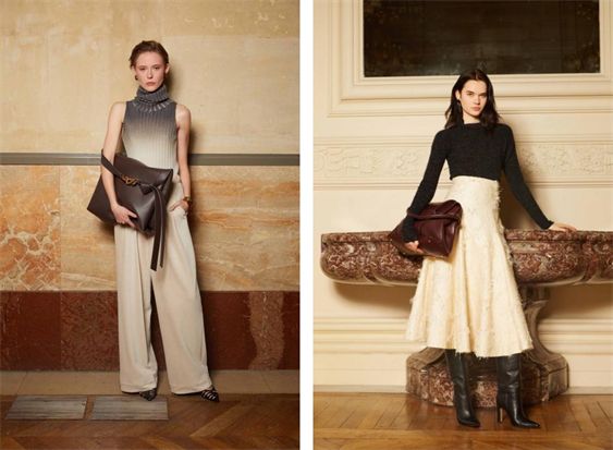 傍晚时分,发布秀徐徐展开,模特于高耸的穹顶之下缓缓穿行,设计师独特的审美将细致入微的木雕技艺融入每一件时装的设计灵感中。斑驳色泽、版画工艺、取自手作工艺与橡木等自然元素,重新解构演绎羊毛大衣、廓形外套、手工针织等品牌标志性时装单品。提取木器轴对称特点的设计结构、色调与色彩的微妙渐变对比,共鸣着流动的静谧诗意时光。