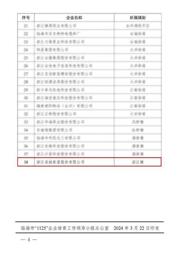 近日,临海市“1125”企业培育工作领导小组办公室公布了《2023年度临海市“1125”企业培育名单的通知》。浙江朵纳家居股份有限公司榜上有名,成功入选 2023年度临海市“1125”企业培育名单。