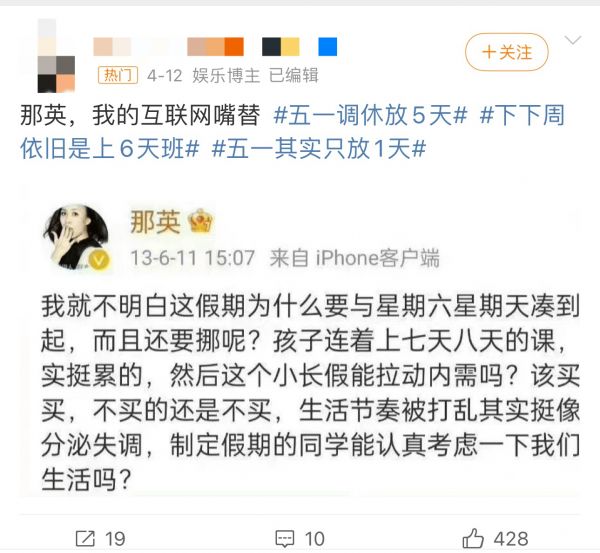 有网友甚至翻出了2013年歌手那英关于调休放假的评论:“我就不明白这假期为什么要与星期六星期天凑到一起,而且还要挪呢?孩子连着上七天八天的课,确实挺累的……生活节奏被打乱其实挺像分泌失调,制定假期的同学能认真考虑一下我们生活吗?”