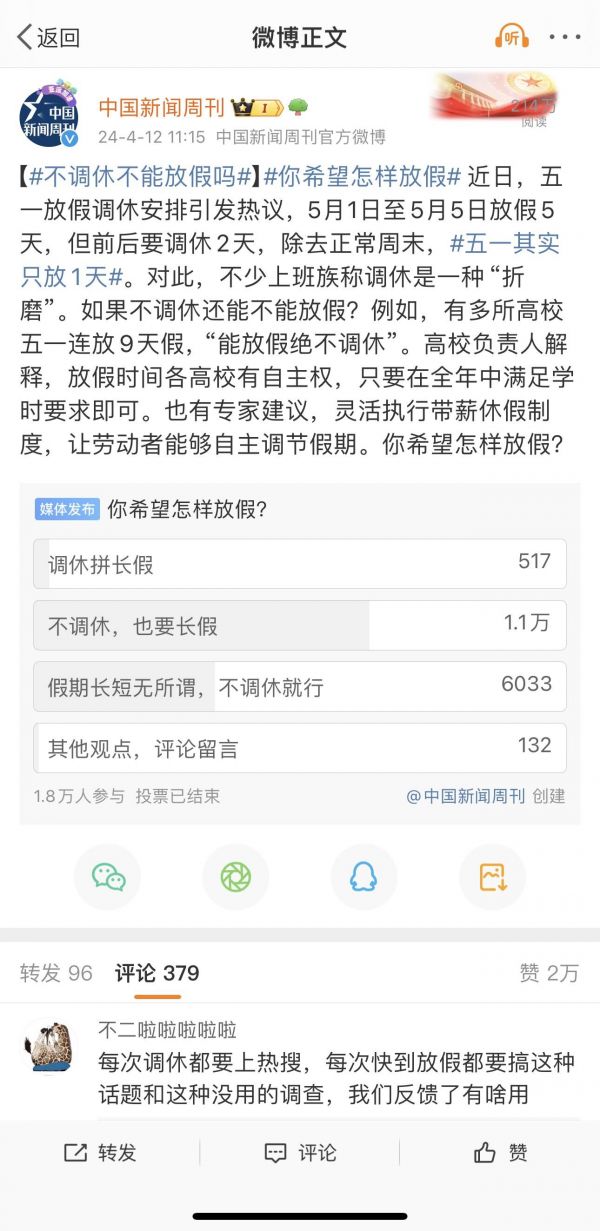 能不能接受五一放一天不调休?微博投票:55%网友“接受”,专家建议:固定法定假日时间
