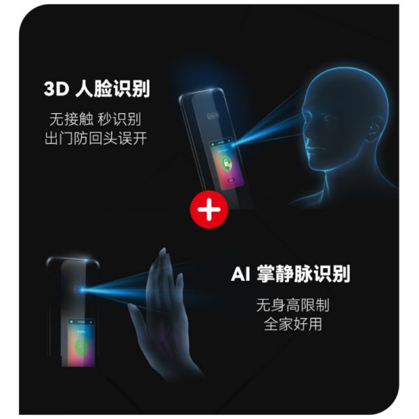 C7Pro使用3D人脸识别与AI掌静脉识别,人到锁开,入户无接触、无停留。特别具备“防回头误开”发明专利技术,有效杜绝离家锁门后,因确认锁门、等候电梯等门前停留导致的自动人脸识别误开门风险。掌静脉识别,无身高限制,不受手掌表皮磨损、潮湿、污渍的影响,适配全年龄段家庭成员,有效解决了老人小孩使用指纹识别率低的问题。