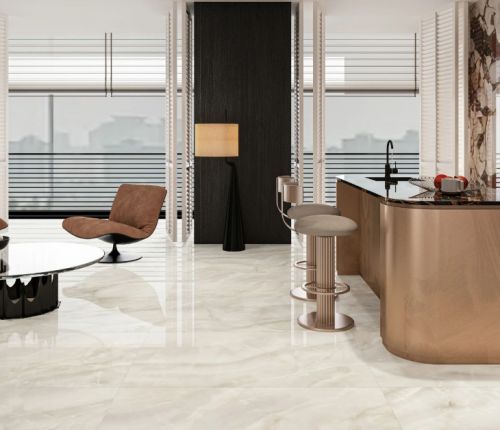 简一瓷砖专注于高端大理石瓷砖领域,其产品以还原天然石材的纹理与光泽见长。整体铺贴效果连贯流畅,犹如整块石材铺就,极大提升了空间的奢华感与整体性。