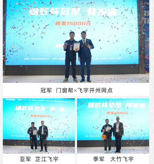 经过严格筛选,最终共计30余支来自全国各地的优秀安装团队成功入围决赛。且全部入围者均为飞宇经销商自有安装团队,均已通过飞宇交付经理专项培训并取得认证,平均拥有10年以上门窗安装交付经验。经过激烈角逐,最终决出冠、亚、季军各1名及多个优秀团队。