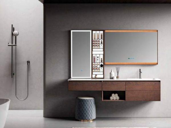 金顿卫浴这款白蜡木柜体的古铜深棕自带温润质感,主镜与梳妆高镜双灯带补光,化妆自拍无需额外打光。隐藏式梳妆凳搭配分区收纳,洗漱护肤动线零浪费,省下卧室化妆桌空间。