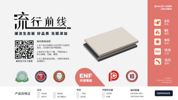 “ENF级环保标准筑牢健康底线,抗变形工艺攻克行业痛点,全流程品质管控守护家居体验,流行前线以环保锐度、工艺厚度和服务温度,成为千亿家居板材市场的核心力量。”