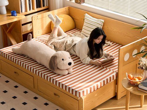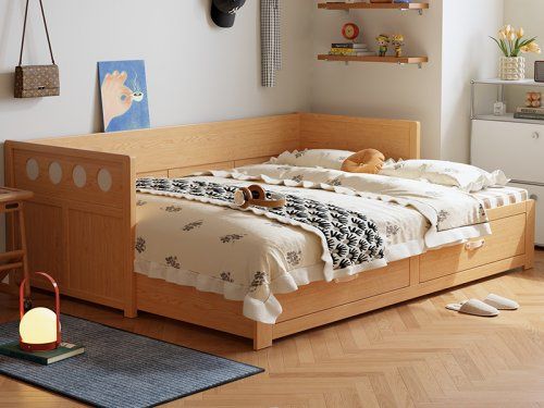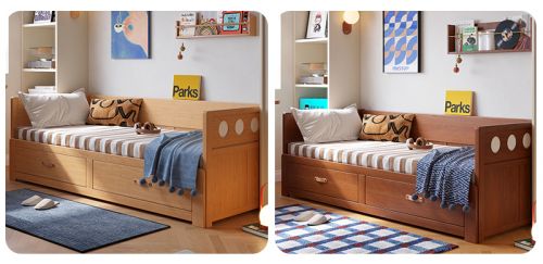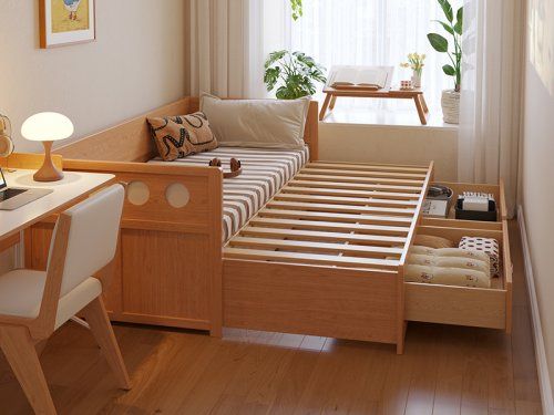 “空间集成主义”亦是一种生活哲学的体现。木宫匠波尔卡沙发床借由原木色与胡桃色两款经典木色,具象化其“理性治愈”的设计语言:前者清新明快,营造现代简约氛围;后者沉稳深邃,赋予空间内敛质感。