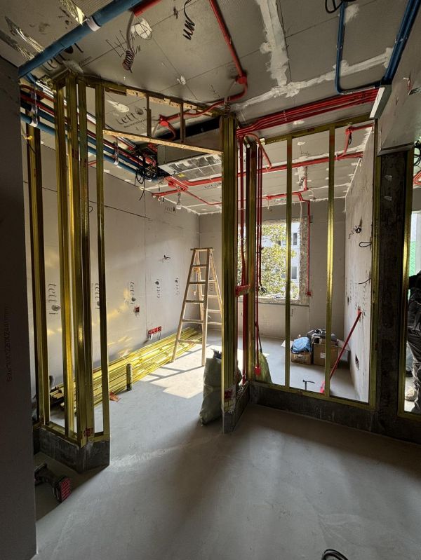 技术方案:对全屋进行新的功能区划分,使用快装龙骨+防水背衬板轻质材料竖起隔墙。