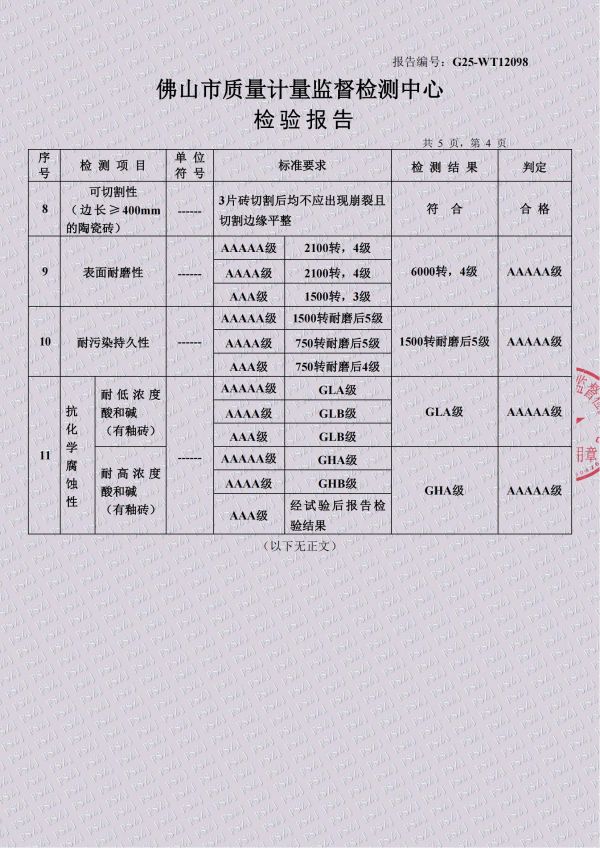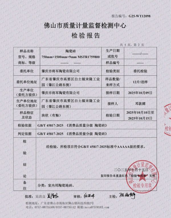 作为深耕建筑陶瓷领域的品质引领者,将军陶瓷集团始终将“产品是企业生命线,品质是发展压舱石”的理念贯穿研发、生产到交付的全链条。从原料甄选、工艺创新到成品检测,集团构建起一套系统、严苛且可追溯的全流程品质管控体系。其产品率先通过国家最新陶瓷砖标准5A级认证,成为行业首批达标企业,以实打实的产品力赢得市场信赖与业界认可,也为屡获殊荣奠定了坚实底气。