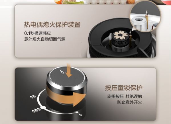 为生活提供周全的安心保障,樱花燃气灶S507GA贴心设计按压童锁保护装置,旋钮先下压再旋转方能开启,有效防止儿童误触或意外开火,从源头上消除安全隐患。同时,热电偶熄火保护装置能在0.1秒内极速响应,一旦检测到意外熄火会立即自动切断气源,杜绝燃气泄漏的风险,为家庭烹饪提供全天候的多重防护。