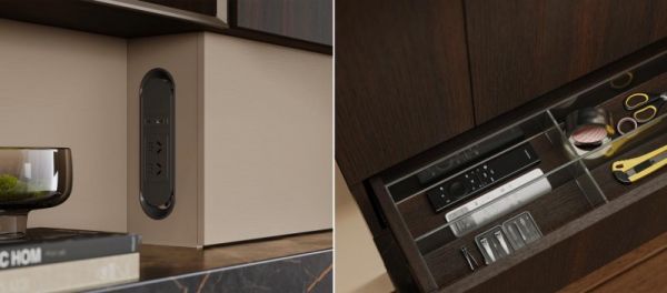 「维克+」同样注重人性化功能细节,提供多种实用收纳模块。电视柜抽屉内可自由选配亚克力或金属分隔件,收纳遥控器、游戏设备等,分类清晰,拿取顺手,告别翻找混乱。柜体配备双面内嵌插座,路由器、机顶盒与线缆等收纳进柜体,隐藏杂乱线缆,视觉上整洁清爽。