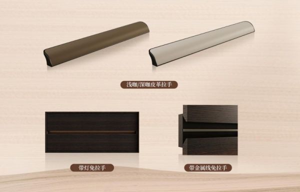 「维克+」配备三款造型拉手以供选择,表面采用皮革包裹与纳米喷涂工艺。皮革与金属搭配,在材质碰撞中实现美学平衡,低调内敛却尽显高级格调。浅咖、深咖皮革拉手,温润雅致,握感舒适;带灯免拉手与带金属线免拉手,简约利落,适配不同家居需求。