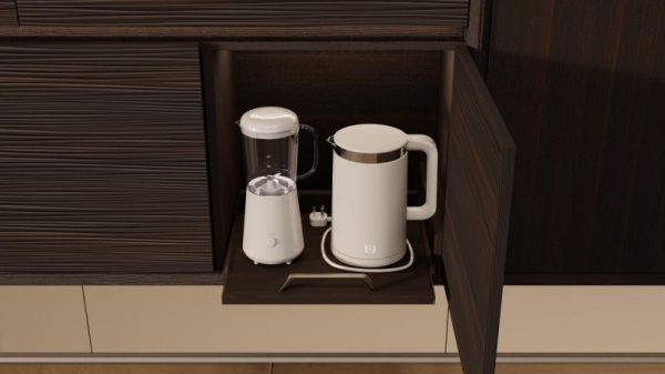 餐边柜内置抽拉置物台,让热水壶、榨汁机等高频使用的小厨电拥有一个专属收纳区。置物台抽拉设计顺滑省力,使用时一拉就出,用完推回原位,柜面瞬间恢复整洁。