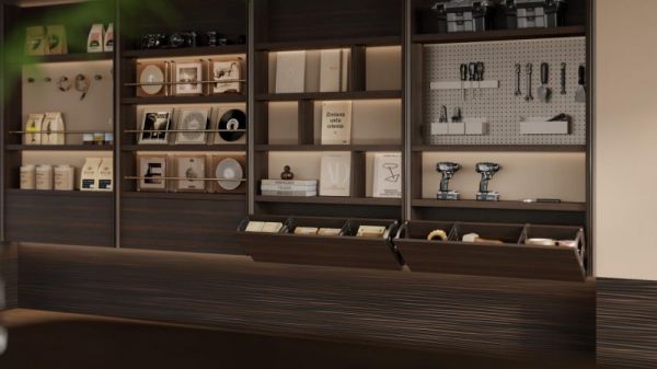 「维克+」多功能柜设计,将宠物用品、兴趣藏品、书籍与工具等多元收纳需求整合,不仅为物品提供分类清晰、各得其所的专属空间,更通过护栏与挂钩系统、便捷的侧翻门柜以及可自由组合的金属洞洞板背板等多种模块化设计,打造出灵活高效的收纳解决方案。