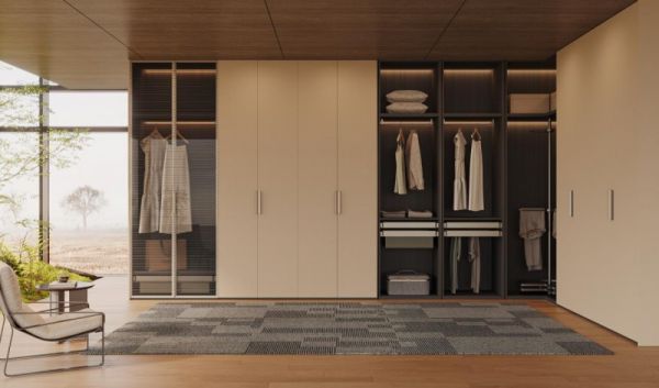 衣柜采用细格纹玻璃柜门,精致纹理提升空间格调,清晰可视,与一门到顶掩门形成虚实结合的美感。大容量储物空间合理分区,衣物被褥、配饰与日常物品井井有条各归其位,轻松满足全家人的收纳所需。