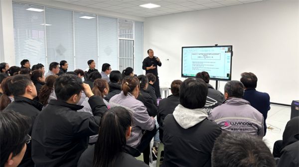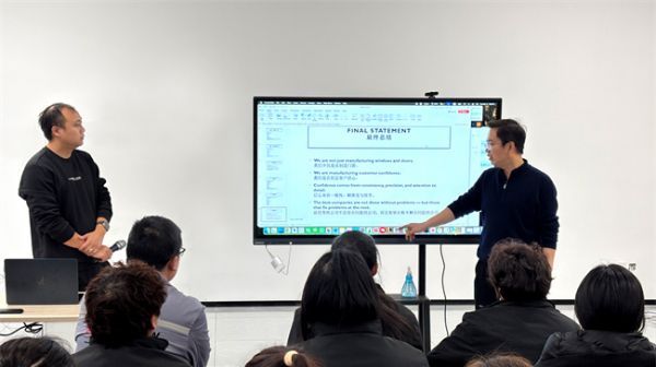 作为中国门窗出口北美第一品牌,门赢始终以行业领先的严苛品质标准筑牢品牌根基,而这份贯穿全流程的品控准则,正源于北美终端市场的持续反馈与生产端的闭环迭代改善。为进一步优化门赢智造中心生产效能、严卡产品品质红线、深度贴合北美客户验收标准,近日,智造中心2026年开工伊始,来自美国LA营销中心的同事Tuck(新加坡裔美国人)来中国总部交流期间,专程赴智造中心为全体员工开展专项培训与深度交流。
