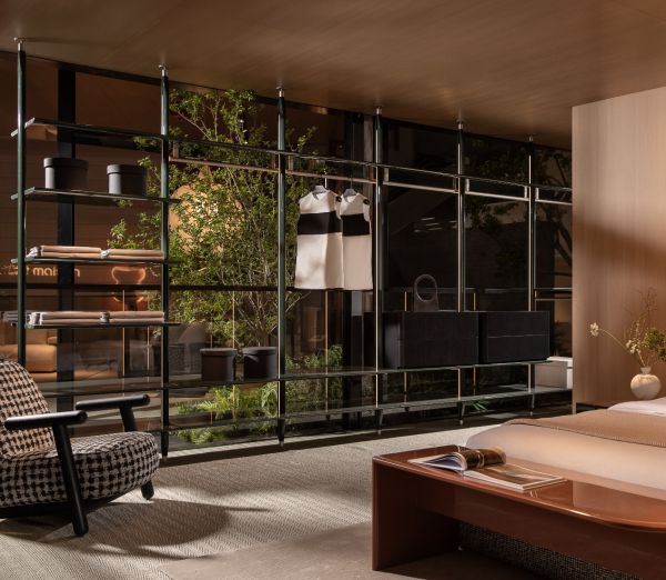 进入展位之后,这里更像一个被拆开呈现的生活街区,而非传统意义上的展厅。整个空间被组织为四个完整生活场景:客厅与书房、卧室与衣帽间、餐厨与会客空间,以及开放的HC28 Café。它们分别对应当代生活中的不同状态——阅读与工作、私密与独处、社交与交流,以及公共生活。不同场景之间没有被刻意分割,而是通过动线与家具关系自然过渡,使空间呈现出一种连续发生的生活节奏。