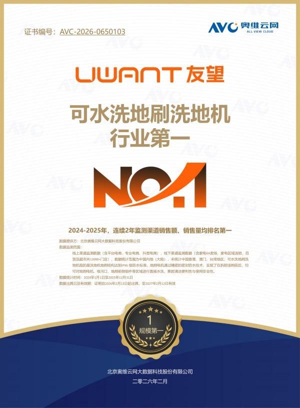 权威认证与细节设计,是有孩家庭洗地机选购的核心底线,直接决定使用安全与日常体验。普通洗地机常因缺乏权威认证、水箱偏小、噪音超标、续航不足,导致清洁中断、吵醒宝宝,给家庭带来多重困扰。友望云朵 2.0 洗地机在两大维度表现突出,更斩获推入式洗地机规模行业第一和可水洗地刷洗地机行业第一,实力彰显品质。