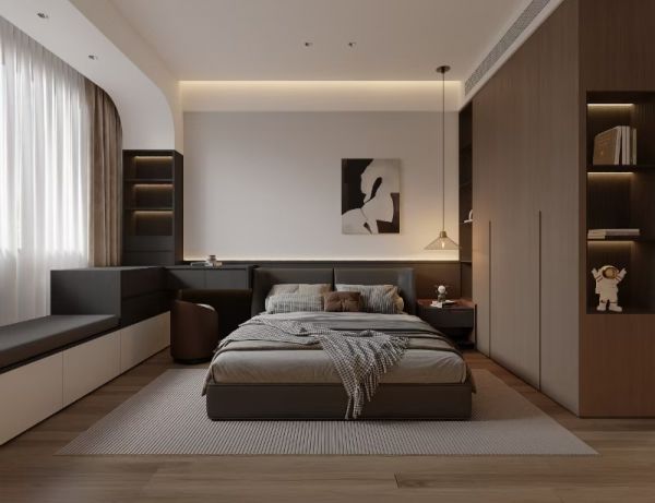 主卧空间则以“静谧疗愈的睡眠秘境”为设计出发点,弱化繁复造型,强化包裹感与舒适感,营造专属的私人安宁领地。整体色调转换为更柔和的低灰度暖色系,温润木地板替代冷感地砖,床头背景墙则以木饰面结合暗藏灯带处理,层层递进的光影关系进一步拉满氛围感。