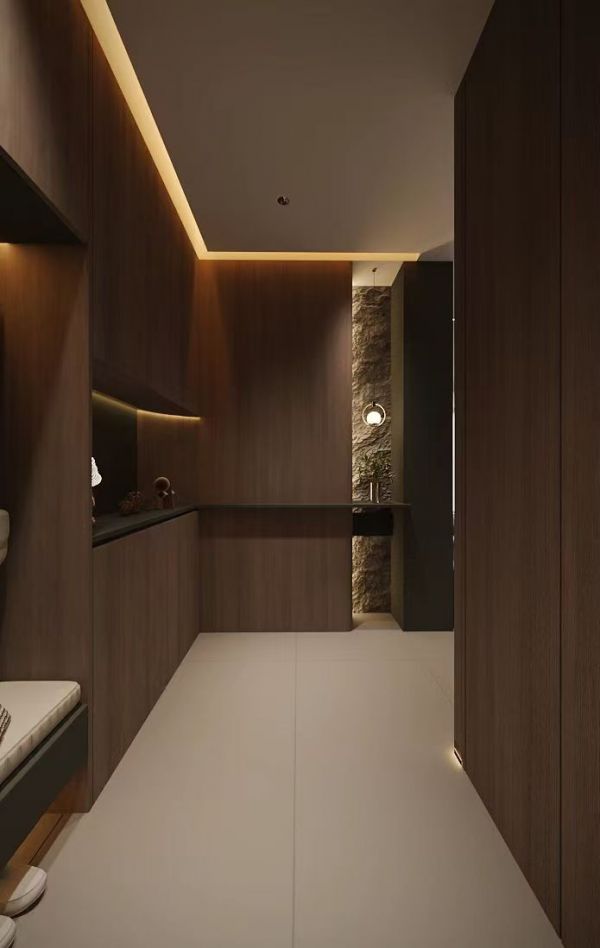 玄关过道作为入户第一眼与整体动线的重要纽带,强调空间的仪式感与引导性。整面通高木作柜体构建出完整入户收纳系统,墙面搭配天然文化石进行局部肌理点缀,尽头以艺术吊灯和绿植造景收束视线。线性地脚灯与顶面氛围灯双向烘托之下,狭长过道告别压抑与局促,步步皆景,归家的仪式感也由此徐徐展开。